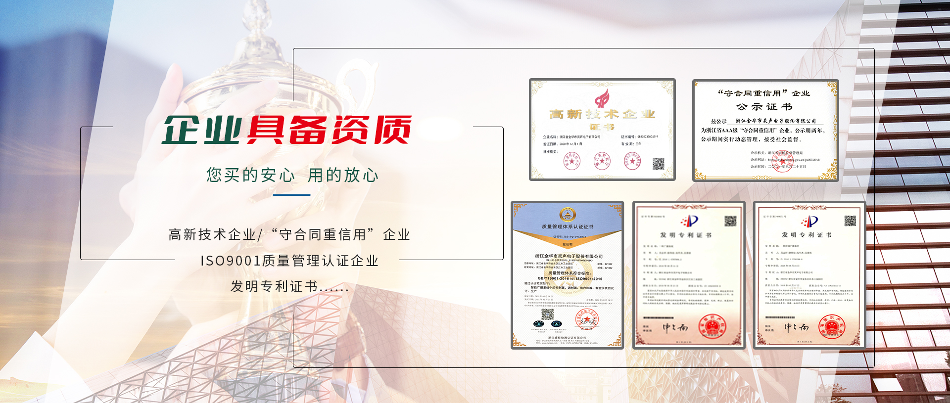 公司榮譽:先后被認定為國家高新技術企業(yè),浙江省高新技術企業(yè),浙江省工商業(yè)守合同重信用單位,浙江省科技型中小企業(yè),金華市專利示范企業(yè),金華市誠信民營企業(yè)等榮譽。